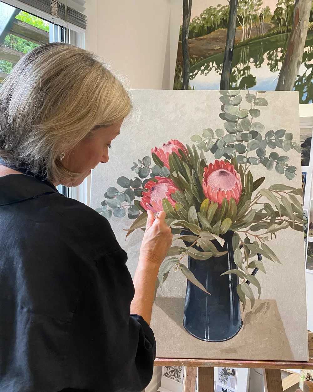 Sue paints predominantly using oil on canvas, and focuses on capturing elements of the natural world around her. She observes colour, texture and pattern in her environment, and brings these observations into her paintings. Her still-life, botanical and landscape paintings can hold associative memories for the viewer. These may be part of a story that involves a gift of flowers, a familiar vase, foliage picked from a walk in the neighbourhood, or simply a special place.